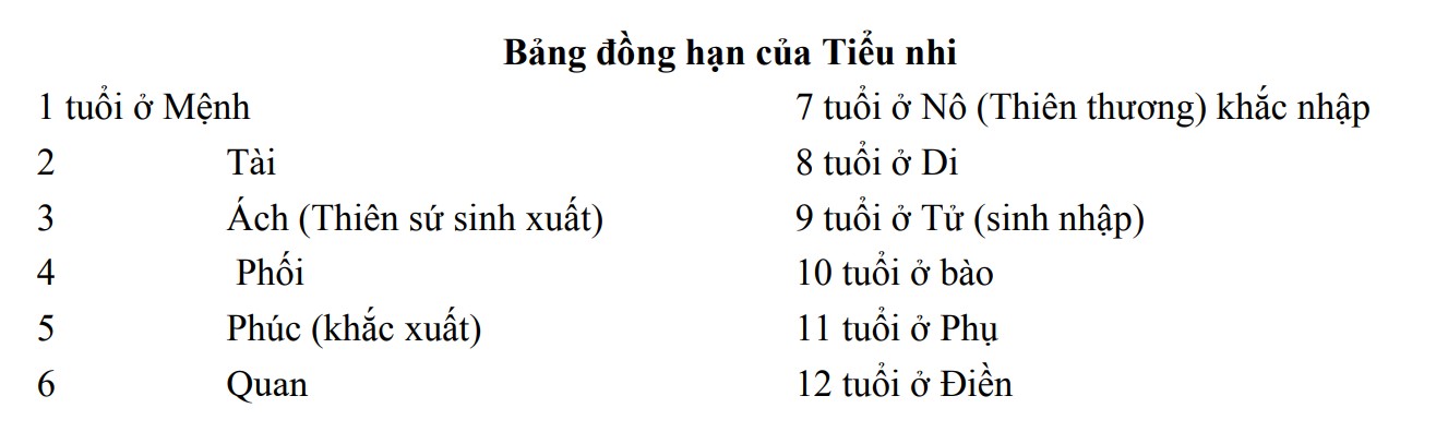 Tuổi người ta có 2 phần: hàng Can là gốc, hàng Chi là ngọn, như tuổi Giáp Tý thì Giáp là Can thuộc Dương Mộc, Tý là chi thuộc Dương Thuỷ thì cứ mỗi năm nào gặp 1 con số 3 hay 7 là những năm bị sinh xuất hay khắc nhập tức là cây bị lay gốc hay bị cắt rễ như 1 tuổi là Giáp Tý. Năm lên 3 tuổi là Bính Dần tức là Giáp sinh Bính là hao mòn cho nên đặt ở ngay cung Tật Ách (Thiên Sứ). Năm tuổi là năm Mậu Thìn ở Phúc Đức chữ Giáp khắc xuất chữ Mậu là Mệnh chiến thắng được năm. Năm 7 tuổi ở Nô (Thiên Thương) là năm Canh Ngọ, chữ Canh khắc chữ Giáp. Đến năm 9 tuổi là Nhâm Thân, Chữ Nhâm sinh cho chữ Giáp ở Tử Tức có nghĩa là nẩy nở. Vậy có thể xắp xếp: