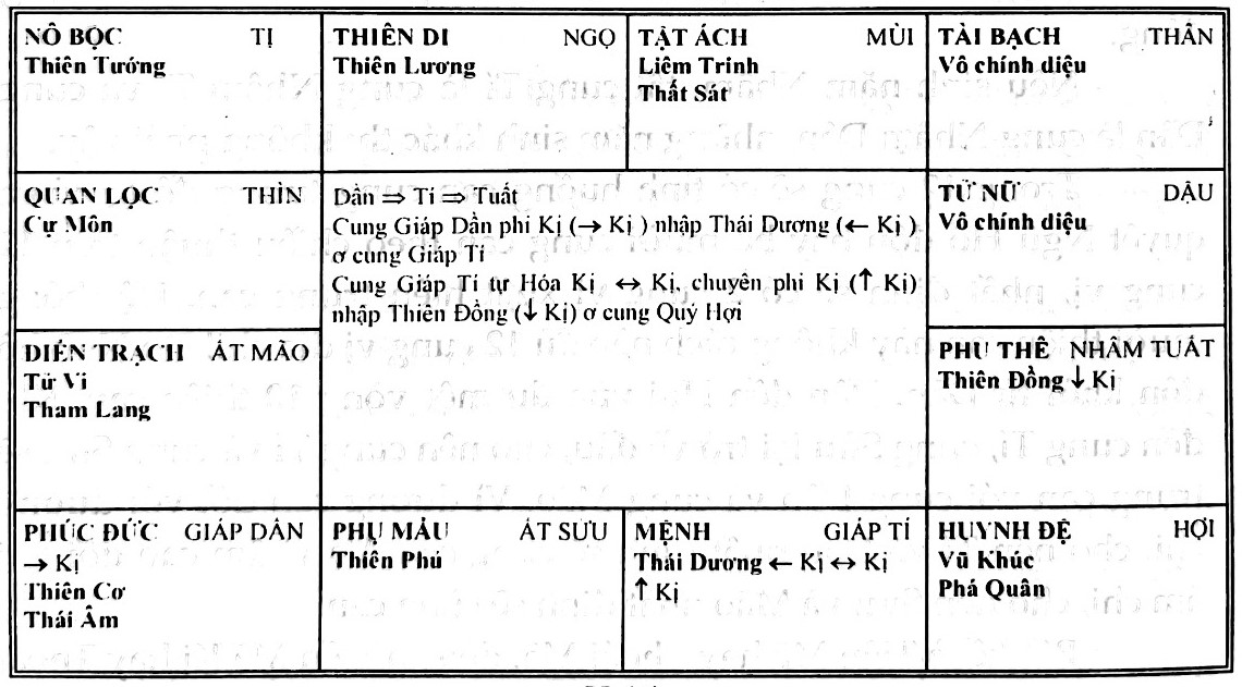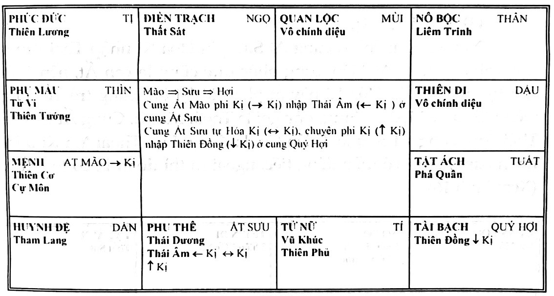 - Phân tích thêm một bước, phi Hóa Kị (hoặc Lộc, Quyền, Khoa) xuất phát từ cung Ất Mão, do gặp tự Hóa Kị của Ất Sửu mà chuyển phi Hóa Kị đến cung hạ xuống.