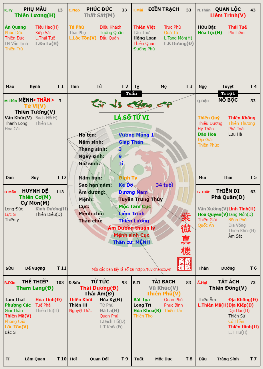 Lá số Tử Vi thứ hai - Vương Mãng Giáp Thân tháng 3 ngày 9 giờ Tí
