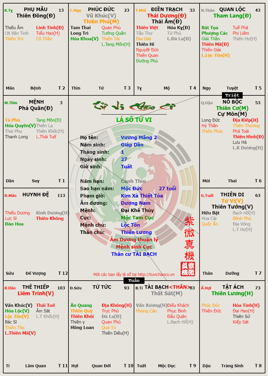 Lá số Tử Vi thứ nhất - Vương Mãng Giáp Dần tháng Giêng ngày 27 giờ Tuất