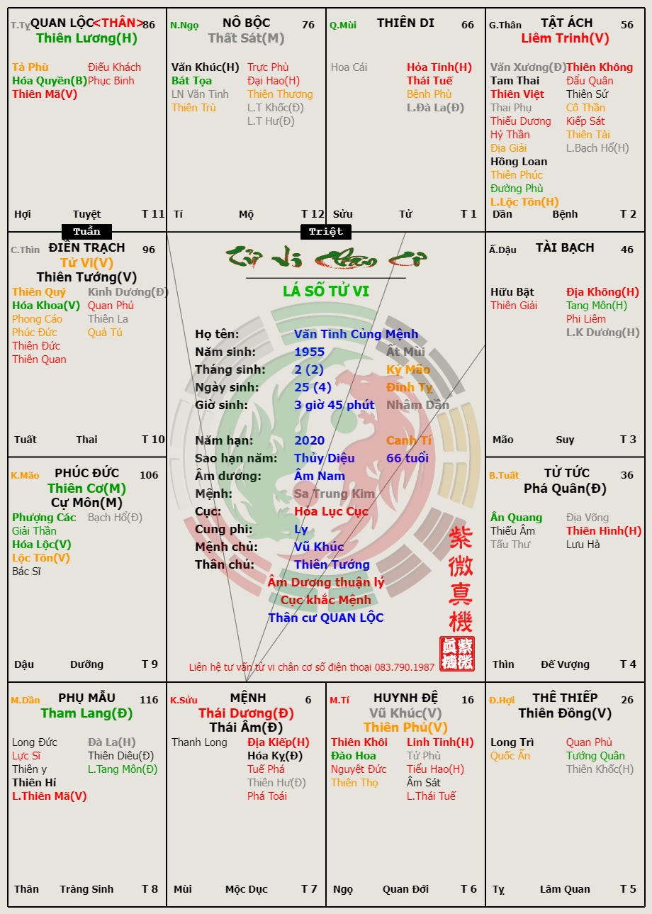 Cho nên tiền bối bình là "học giỏi, thành tích ưu tú, thi cử thường xuyên đạt hạng nhất". Sau khi ra xã hội, từ chủ tinh ở cung Mệnh có tính chất "phục vụ, chính trị" lại có khuynh hướng "Văn học" liên quan đến "Văn xương, Văn Khúc" nên thiên về các công việc như: Mở nhà in, xưởng in ấn hoặc trường luyện thi...